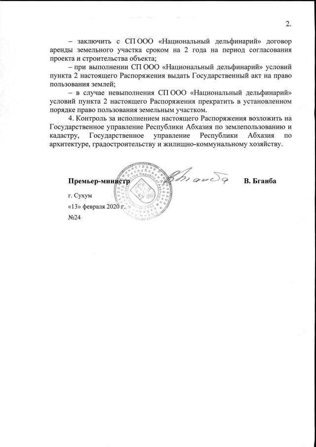 РАСПОРЯЖЕНИЕ Кабинета Министров Республики Абхазия от 13.02.2020 №24 "О даче согласия Администрации Гагрского района на предоставление СП ООО "Национальный дельфинарий" 0,73 га земли в г. Гагра для строительства дельфинария"