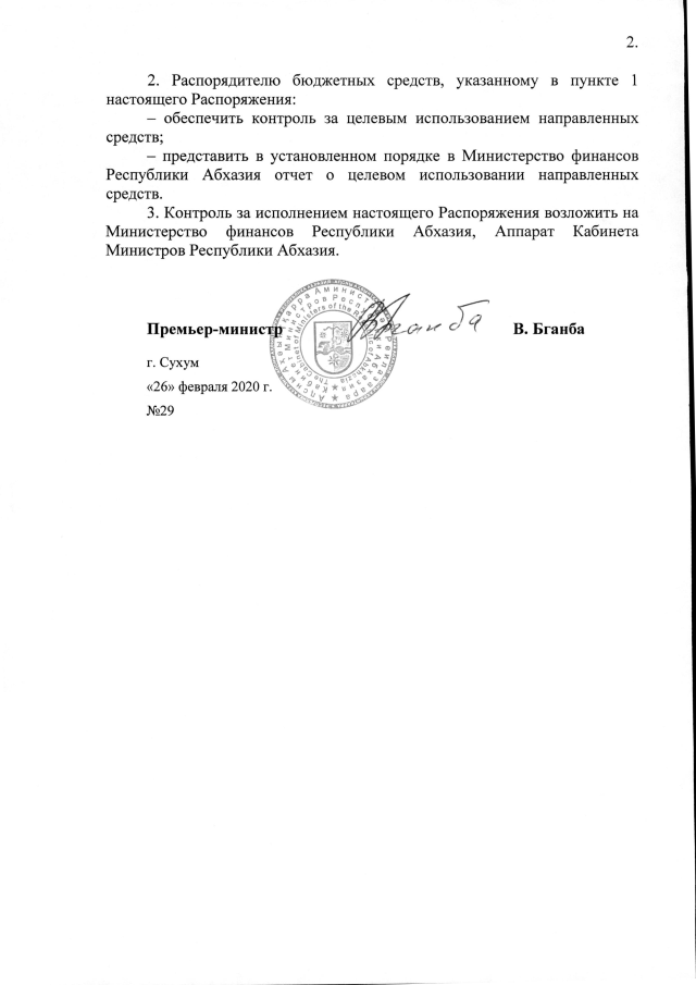 РАСПОРЯЖЕНИЕ Кабинета Министров Республики Абхазия от 26.02.2020 №29 "Об использовании средств резервного фонда Кабинета Министров Республики Абхазия"