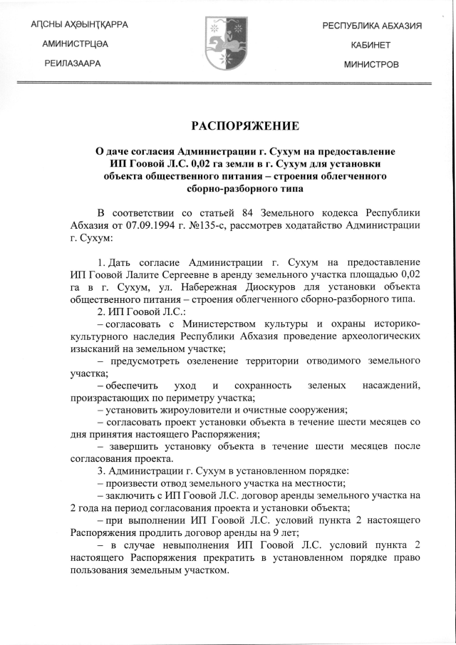 РАСПОРЯЖЕНИЕ Кабинета Министров Республики Абхазия от 27.02.2020 №36 "О даче согласия Администрации г. Сухум на предоставление ИП Гоовой Л.С. 0,02 га земли в г. Сухум для установки объекта общественного питания - строения облегченного сборно-разборного типа"