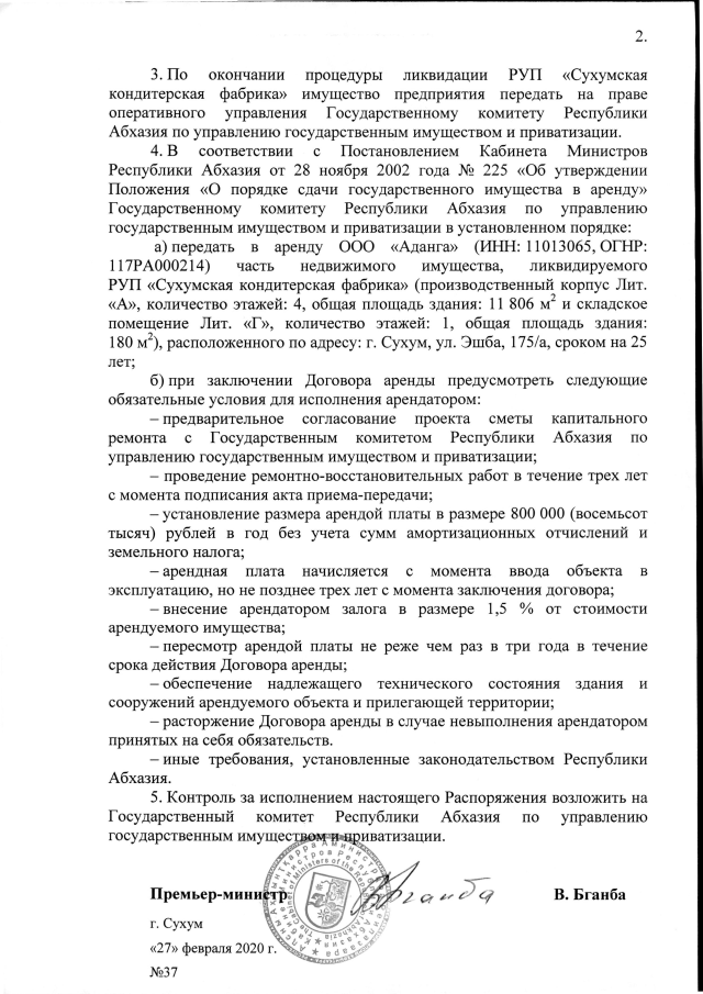 РАСПОРЯЖЕНИЕ Кабинета Министров Республики Абхазия от 27.02.2020 №37 "О ликвидации Республиканского унитарного предприятия "Сухумская кондитерская фабрика" и передаче недвижимого имущества в аренду"