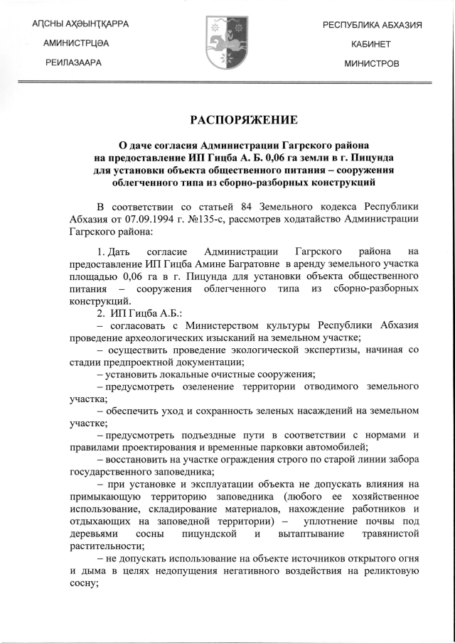 РАСПОРЯЖЕНИЕ Кабинета Министров Республики Абхазия от 02.03.2020 №38 "О даче согласия Администрации Гагрского района на предоставление ИП Гицба А. Б. 0,06 га земли в г. Пицунда для установки объекта общественного питания - сооружения облегченного типа из сборно-разборных конструкций"