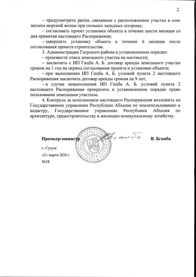 РАСПОРЯЖЕНИЕ Кабинета Министров Республики Абхазия от 02.03.2020 №38 "О даче согласия Администрации Гагрского района на предоставление ИП Гицба А. Б. 0,06 га земли в г. Пицунда для установки объекта общественного питания - сооружения облегченного типа из сборно-разборных конструкций"