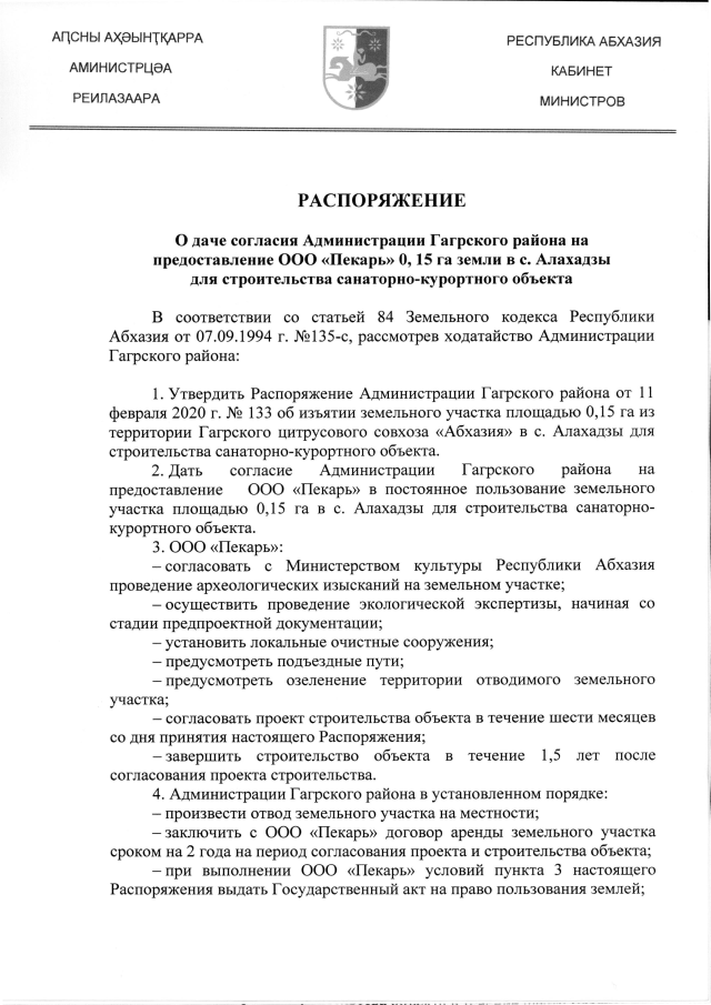 РАСПОРЯЖЕНИЕ Кабинета Министров Республики Абхазия от 04.03.2020 №40 "О даче согласия Администрации Гагрского района на предоставление ООО "Пекарь" О, 15 га земли в с. Алахадзы для строительства санаторно-курортного объекта"