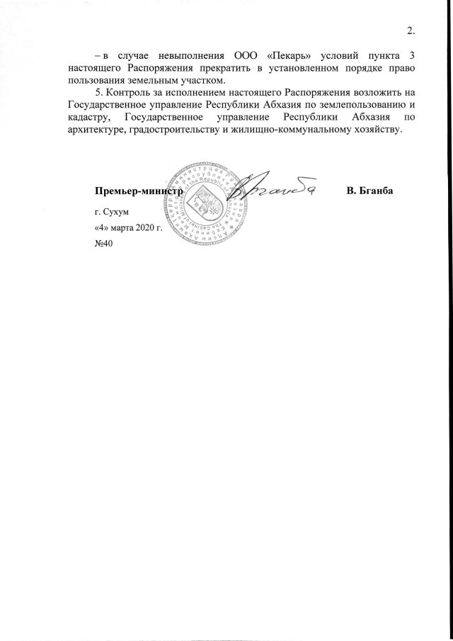 РАСПОРЯЖЕНИЕ Кабинета Министров Республики Абхазия от 04.03.2020 №40 "О даче согласия Администрации Гагрского района на предоставление ООО "Пекарь" О, 15 га земли в с. Алахадзы для строительства санаторно-курортного объекта"
