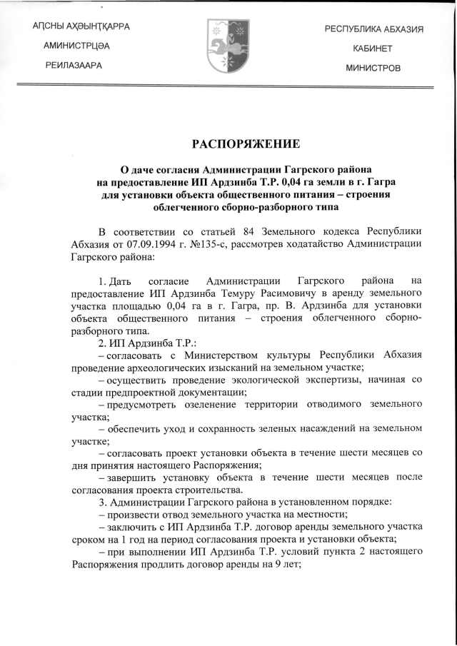 РАСПОРЯЖЕНИЕ Кабинета Министров Республики Абхазия от 10.03.2020 №41 "О даче согласия Администрации Гагрского района на предоставление ИП Ардзинба Т.Р. 0,04 га земли в г. Гаградля установки объекта общественного питания - строения облегченного сборно-разборного типа"