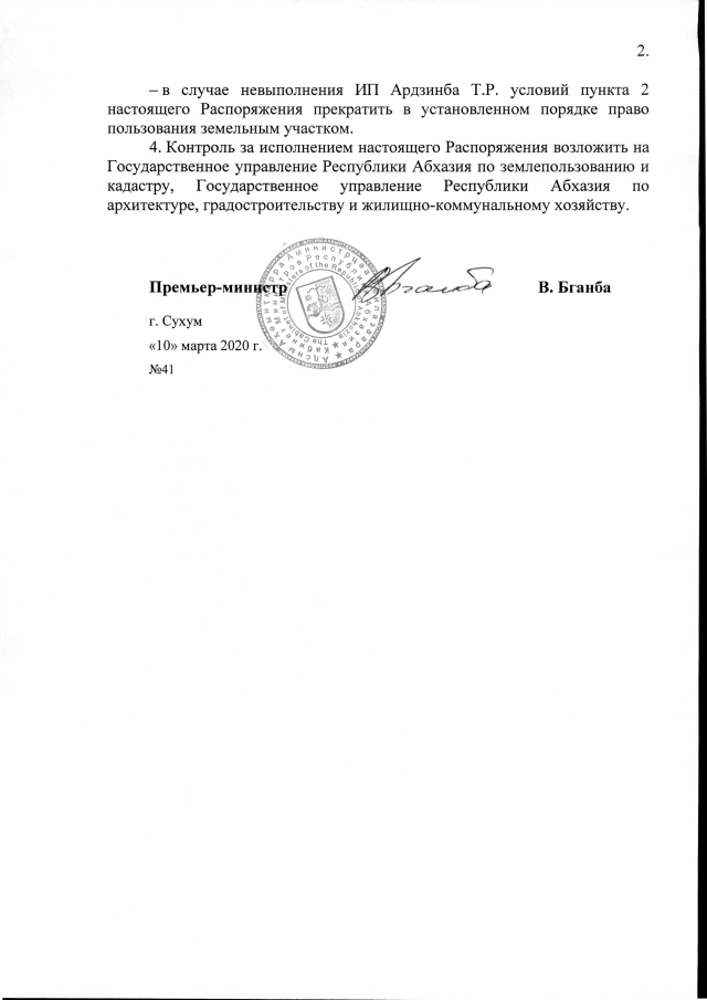 РАСПОРЯЖЕНИЕ Кабинета Министров Республики Абхазия от 10.03.2020 №41 "О даче согласия Администрации Гагрского района на предоставление ИП Ардзинба Т.Р. 0,04 га земли в г. Гаградля установки объекта общественного питания - строения облегченного сборно-разборного типа"
