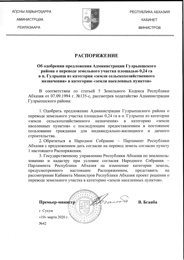 РАСПОРЯЖЕНИЕ Кабинета Министров Республики Абхазия от 10.03.2020 №42 "Об одобрении предложения Администрации Гулрыпшского района о переводе земельного участка площадью 0,24 га в п. Гулрыпш из категории "земли сельскохозяйственного назначения" в категорию "земли населенных пунктов""