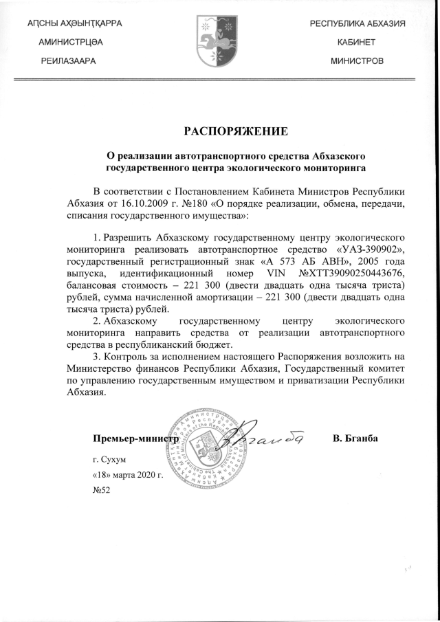 РАСПОРЯЖЕНИЕ Кабинета Министров Республики Абхазия от 18.03.2020 №52 "О реализации автотранспортного средства Абхазского государственного центра экологического мониторинга"