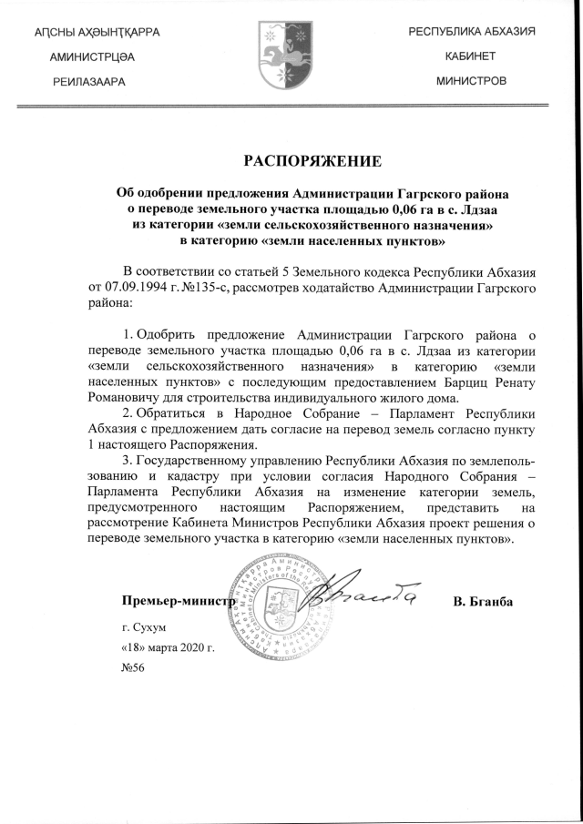 РАСПОРЯЖЕНИЕ Кабинета Министров Республики Абхазия от 18.03.2020 №56 "Об одобрении предложения Администрации Гагрского района о переводе земельного участка площадью 0,06 га в с. Лдзаа из категории "земли сельскохозяйственного назначения" в категорию "земли населенных пунктов""