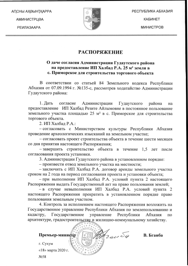 РАСПОРЯЖЕНИЕ Кабинета Министров Республики Абхазия от 18.03.2020 №58 "О даче согласия Администрации Гудаутского района на предоставление ИП Халбад Р.А. 25 м2 земли в с. Приморское для строительства торгового объекта"