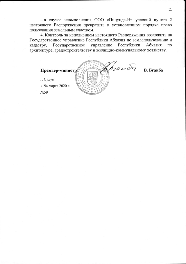 РАСПОРЯЖЕНИЕ Кабинета Министров Республики Абхазия от 19.03.2020 №59 "О даче согласия Администрации Гагрского района на предоставление ООО "Пицунда-Н" 0,31га земли в г. Пицунда для строительства средства размещения санаторно-курортного типа"