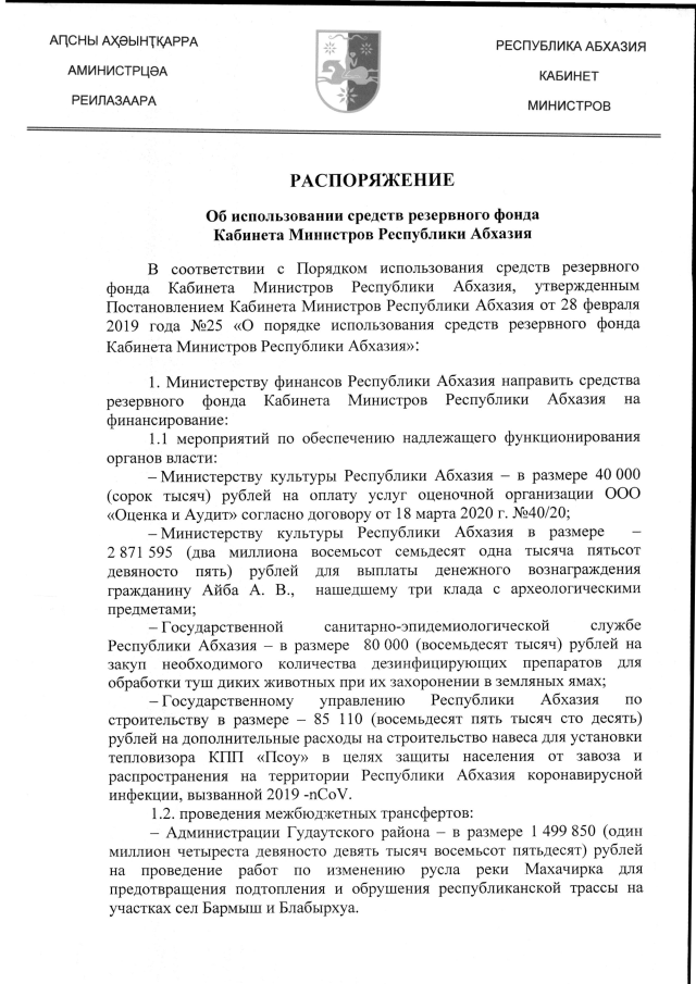 РАСПОРЯЖЕНИЕ Кабинета Министров Республики Абхазия от 27.03.2020 №66 "Об использовании средств резервного фонда Кабинета Министров Республики Абхазия"