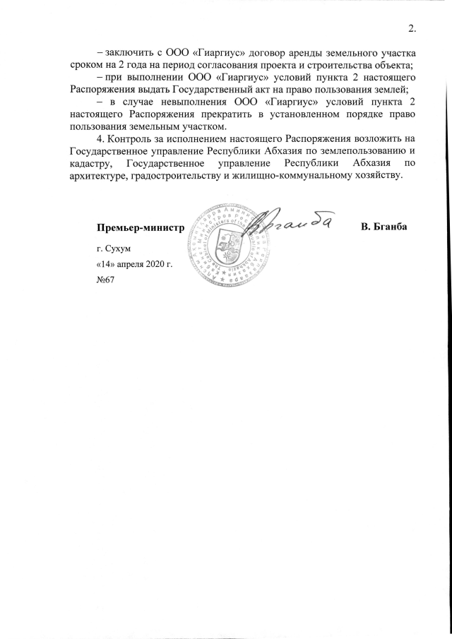 РАСПОРЯЖЕНИЕ Кабинета Министров Республики Абхазия от 14.04.2020 №67 "О переводе земельного участка площадью 0,95 га в с. Дранда Гулрыпшского района из категории "земли сельскохозяйственного назначения" в категорию "земли рекреационного назначения" и предоставлении ООО "Гиаргиус" для строительства туристской базы"