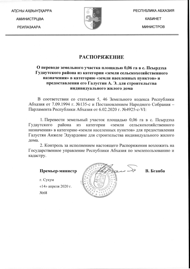 РАСПОРЯЖЕНИЕ Кабинета Министров Республики Абхазия от 14.04.2020 №68 "О переводе земельного участка площадью 0,06 га в с. Псырдзха Гудаутского района из категории "земли сельскохозяйственного назначения" в категорию "земли населенных пунктов" и предоставлении его Галустян А. Э. для строительства индивидуального жилого дома"