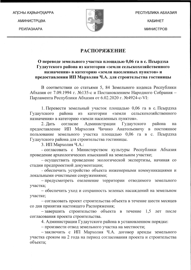 РАСПОРЯЖЕНИЕ Кабинета Министров Республики Абхазия от 14.04.2020 №71 "О переводе земельного участка площадью 0,06 га в с. Псырдзха Гудаутского района из категории "земли сельскохозяйственного назначения" в категорию "земли населенных пунктов" и предоставлении ИП Мархолия Ч.А. для строительства гостиницы"