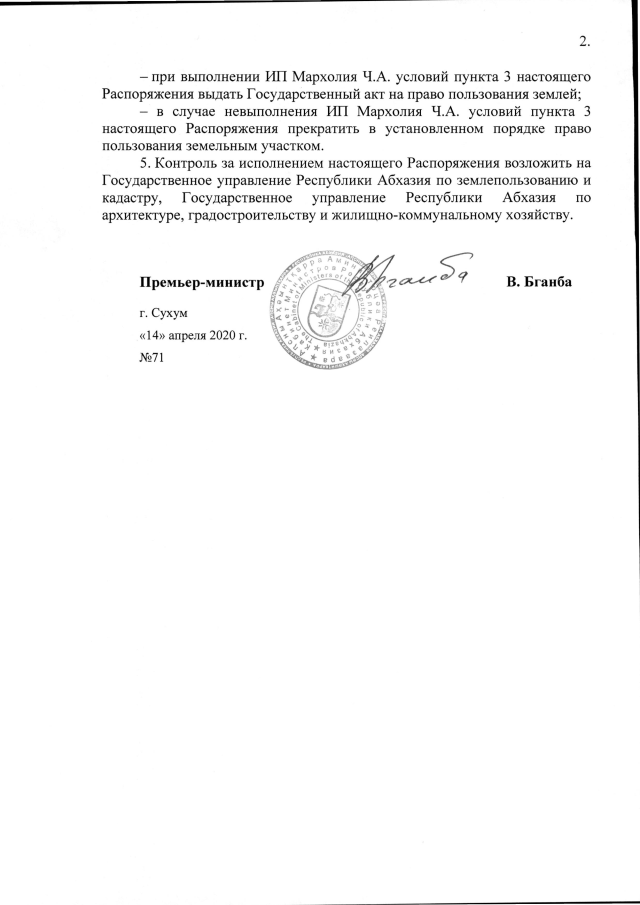 РАСПОРЯЖЕНИЕ Кабинета Министров Республики Абхазия от 14.04.2020 №71 "О переводе земельного участка площадью 0,06 га в с. Псырдзха Гудаутского района из категории "земли сельскохозяйственного назначения" в категорию "земли населенных пунктов" и предоставлении ИП Мархолия Ч.А. для строительства гостиницы"