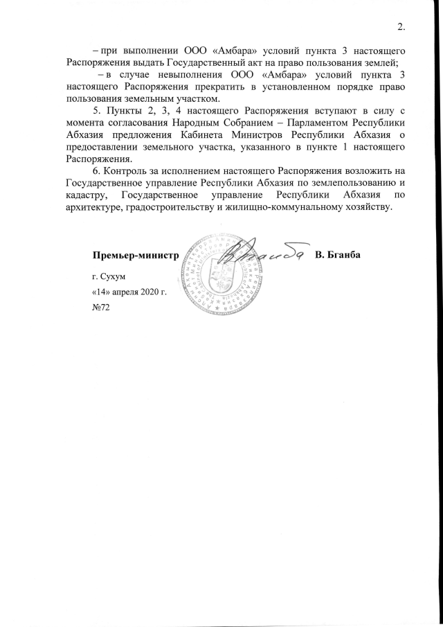РАСПОРЯЖЕНИЕ Кабинета Министров Республики Абхазия от 14.04.2020 №72 "О предоставлении ООО "Амбара" 0,65 га земли в пос. Мысра Гудаутского района для строительства туристской деревни"