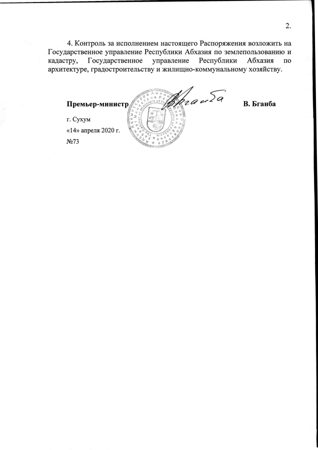 РАСПОРЯЖЕНИЕ Кабинета Министров Республики Абхазия от 14.04.2020 №73 "О даче согласия Администрации Гагрского района на предоставление ООО "Посейдон" земельного участка площадью 0,02 га в г. Гагра для строительства офисных помещений для обслуживания водолазной станции"