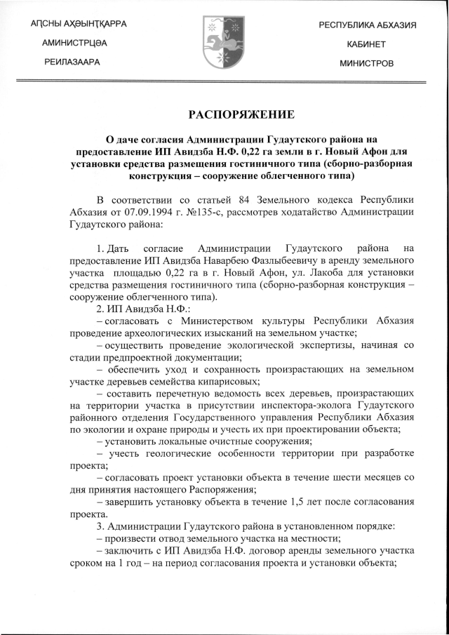 РАСПОРЯЖЕНИЕ Кабинета Министров Республики Абхазия от 14.04.2020 №75 "О даче согласия Администрации Гудаутского района на предоставление ИП Авидзба Н.Ф. 0,22 га земли в г. Новый Афон для установки средства размещения гостиничного типа (сборно-разборная конструкция - сооружение облегченного типа)"