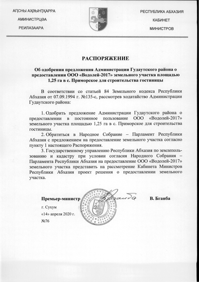 РАСПОРЯЖЕНИЕ Кабинета Министров Республики Абхазия от 14.04.2020 №76 "Об одобрении предложения Администрации Гудаутского района о предоставлении ООО "Водолей-2017" земельного участка площадью 1,25 га в с. Приморское для строительства гостиницы"