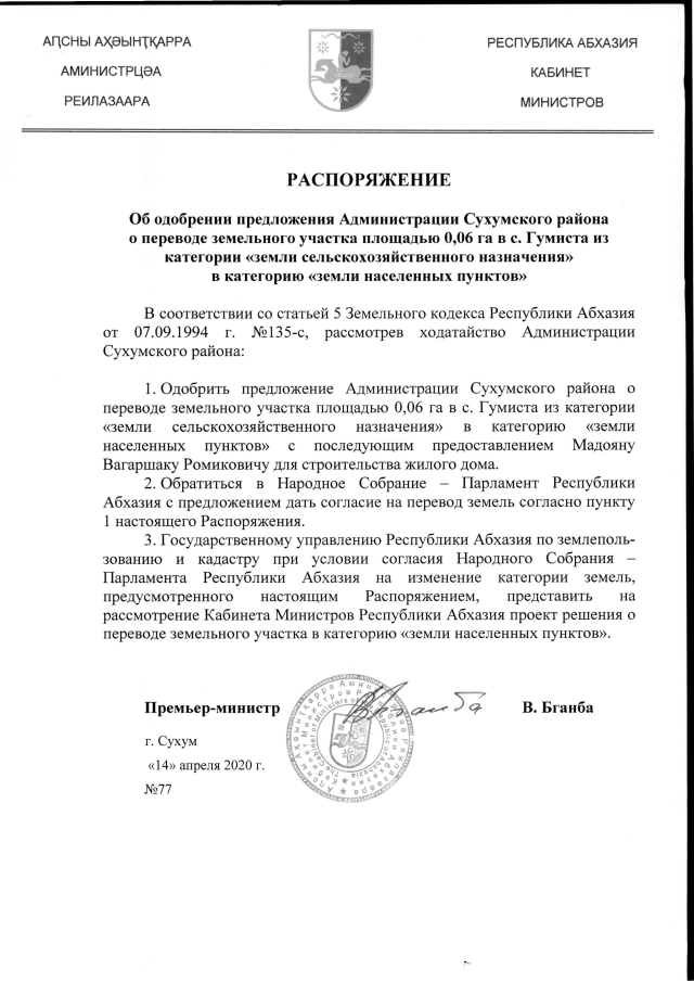 РАСПОРЯЖЕНИЕ Кабинета Министров Республики Абхазия от 14.04.2020 №77 "Об одобрении предложения Администрации Сухумского района о переводе земельного участка площадью 0,06 га в с. Гумиста из категории "земли сельскохозяйственного назначения" в категорию "земли населенных пунктов""