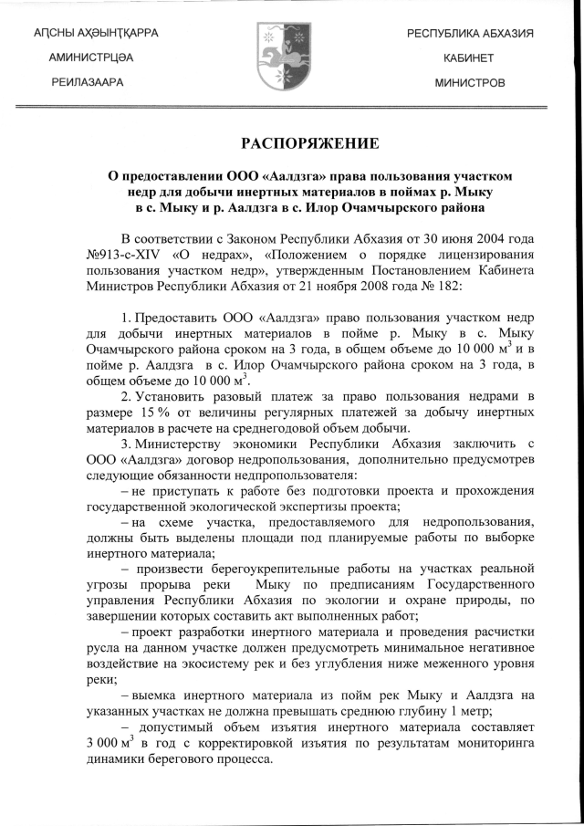 РАСПОРЯЖЕНИЕ Кабинета Министров Республики Абхазия от 14.04.2020 №80 "О предоставлении ООО "Аалдзга" права пользования участком недр для добычи инертных материалов в поймах р. Мыку в с. Мыку и р. Аалдзга в с. Илор Очамчырского района"
