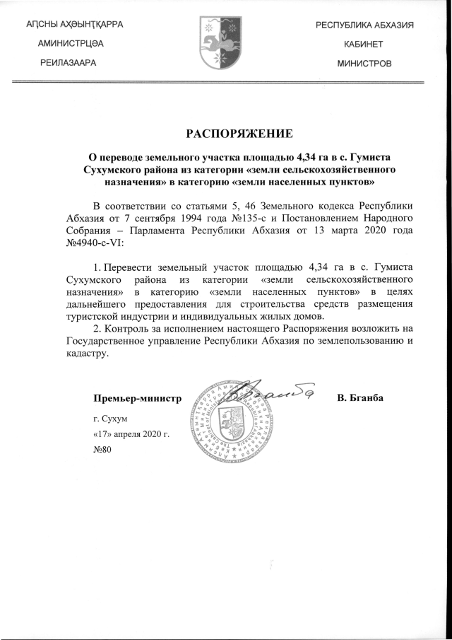 РАСПОРЯЖЕНИЕ Кабинета Министров Республики Абхазия от 17.04.2020 №80а "О переводе земельного участка площадью 4,34 га в с. Гумиста Сухумского района из категории "земли сельскохозяйственного назначения" в категорию "земли населенных пунктов""