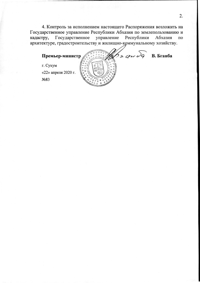 РАСПОРЯЖЕНИЕ Кабинета Министров Республики Абхазия от 22.04.2020 №83 "О даче согласия Администрации Гагрского района на предоставление ООО "Морской бриз" 0,30 га земли в пос. Цандрыпш для строительства гостиницы"