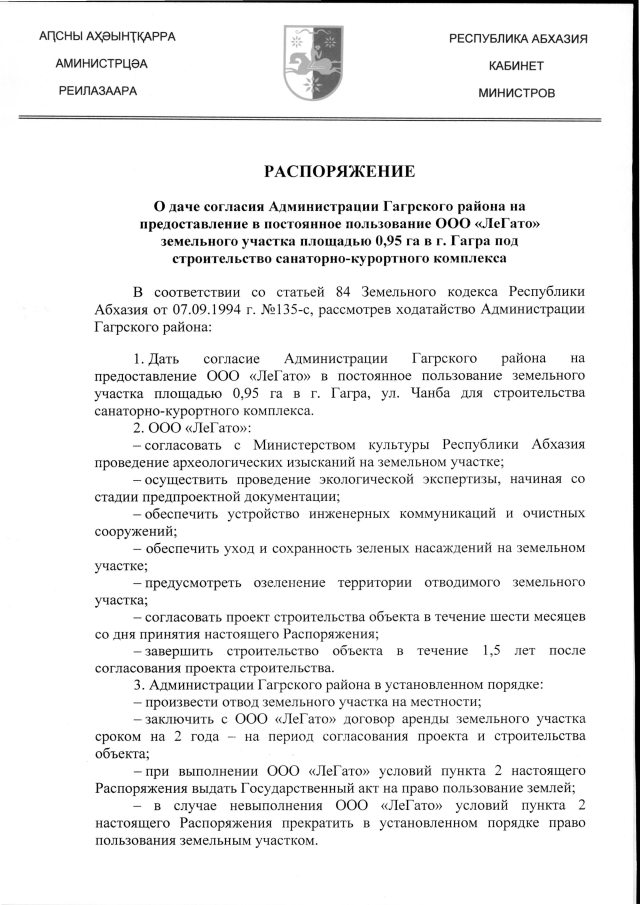 РАСПОРЯЖЕНИЕ Кабинета Министров Республики Абхазия от 22.04.2020 №85 "О даче согласия Администрации Гагрского района на предоставление в постоянное пользование ООО "ЛеГато" земельного участка площадью 0,95 га в г. Гагра под строительство санаторно-курортного комплекса"