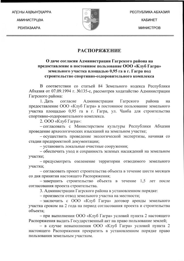 РАСПОРЯЖЕНИЕ Кабинета Министров Республики Абхазия от 22.04.2020 №84 "О даче согласия Администрации Гагрского района на предоставление в постоянное пользование ООО "Клуб Гагра" земельного участка площадью 0,95 га в г. Гагра под строительство спортивно-оздоровительного комплекса"