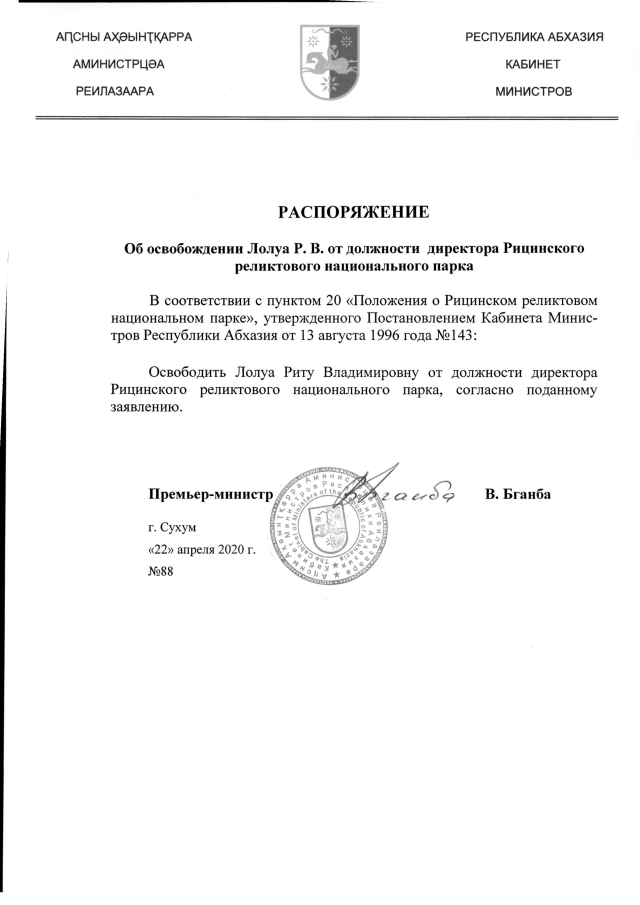 РАСПОРЯЖЕНИЕ Кабинета Министров Республики Абхазия от 22.04.2020 №88 "Об освобождении Лолуа Р.В. от должности директора Рицинского реликтового национального парка"