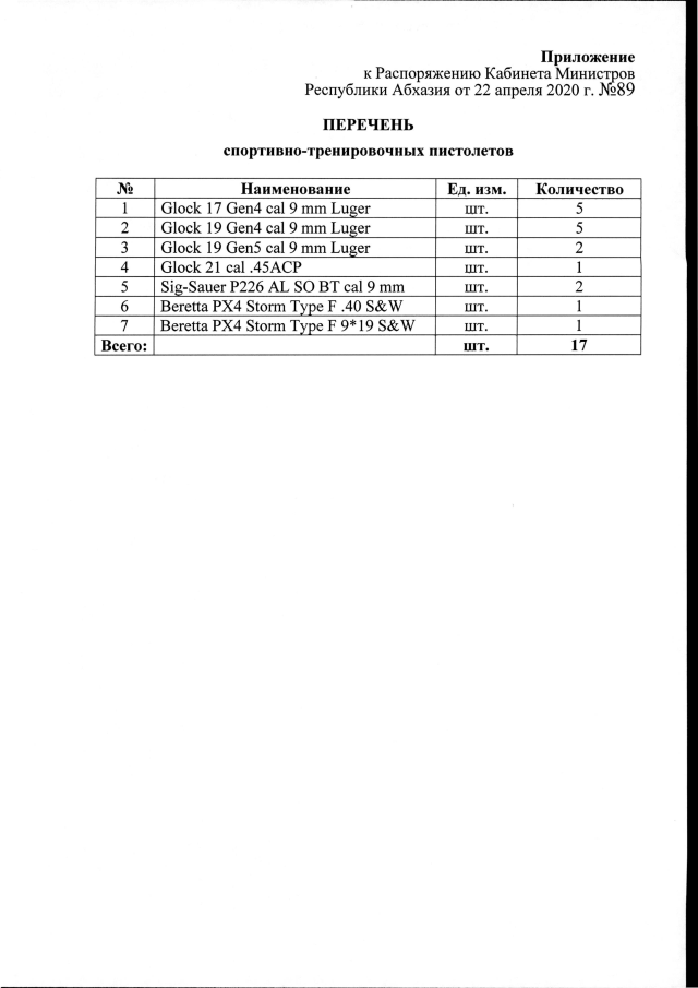 РАСПОРЯЖЕНИЕ Кабинета Министров Республики Абхазия от 22.04.2020 №89 "О выдаче ООО "Абхазский стрелковый клуб" разрешения на ввоз в Республику Абхазия спортивно-тренировочных пистолетов"