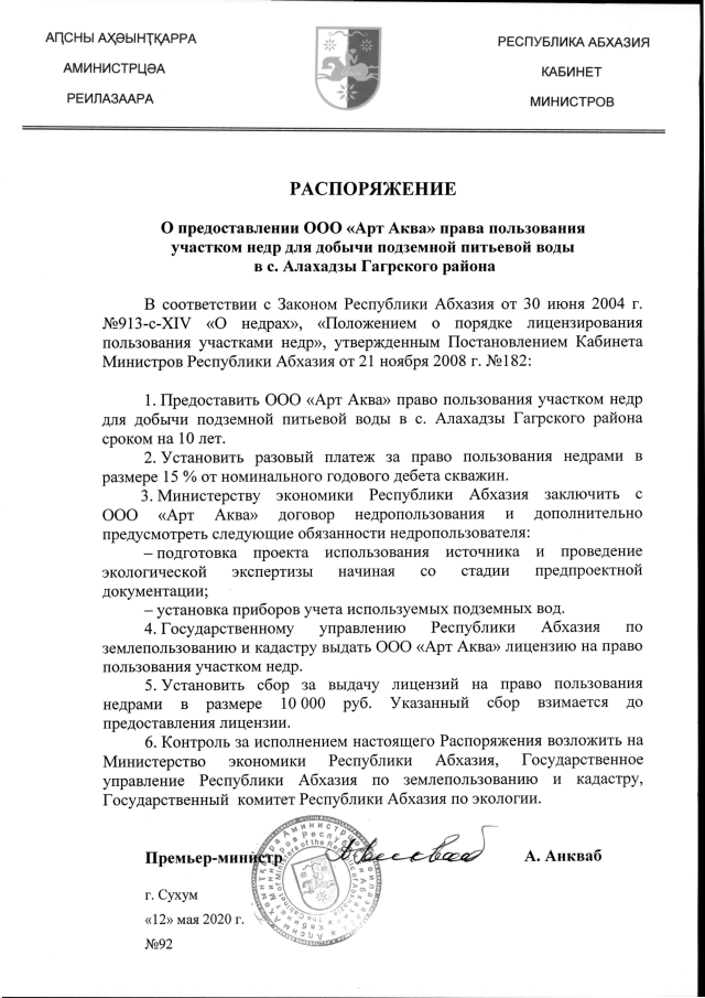 РАСПОРЯЖЕНИЕ Кабинета Министров Республики Абхазия от 12.05.2020 №92 "О предоставлении ООО "Арт Аква" права пользования участком недр для добычи подземной питьевой воды в с. Алахадзы Гагрского района"