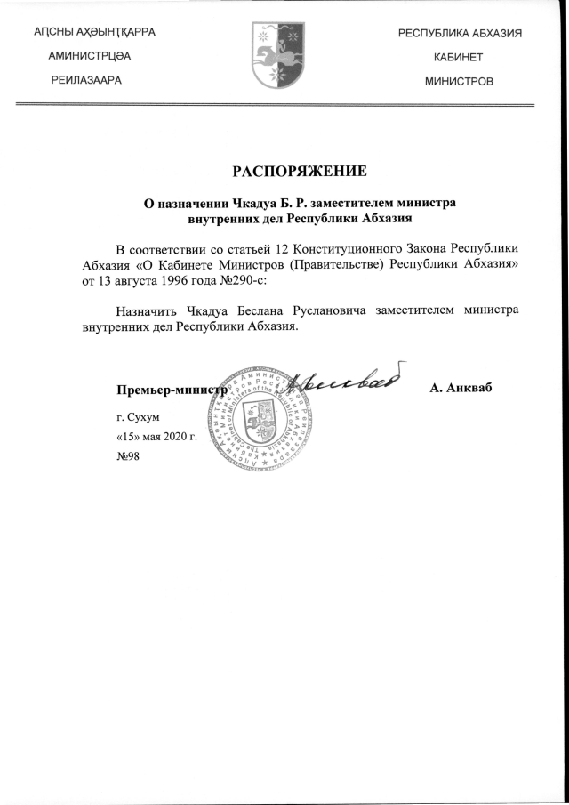 РАСПОРЯЖЕНИЕ Кабинета Министров Республики Абхазия от 15.05.2020 №98 "О назначении Чкадуа Б.Р. заместителем министра внутренних дел Республики Абхазия"