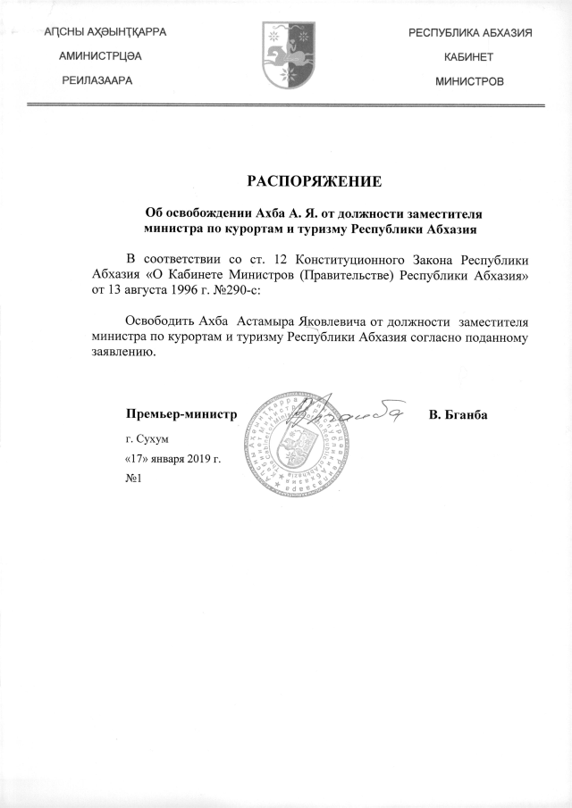 РАСПОРЯЖЕНИЕ Кабинета Министров Республики Абхазия от 17.01.2019 №1 "Об освобождении Ахба А.Я. от должности заместителя министра по курортам и туризму Республики Абхазия"