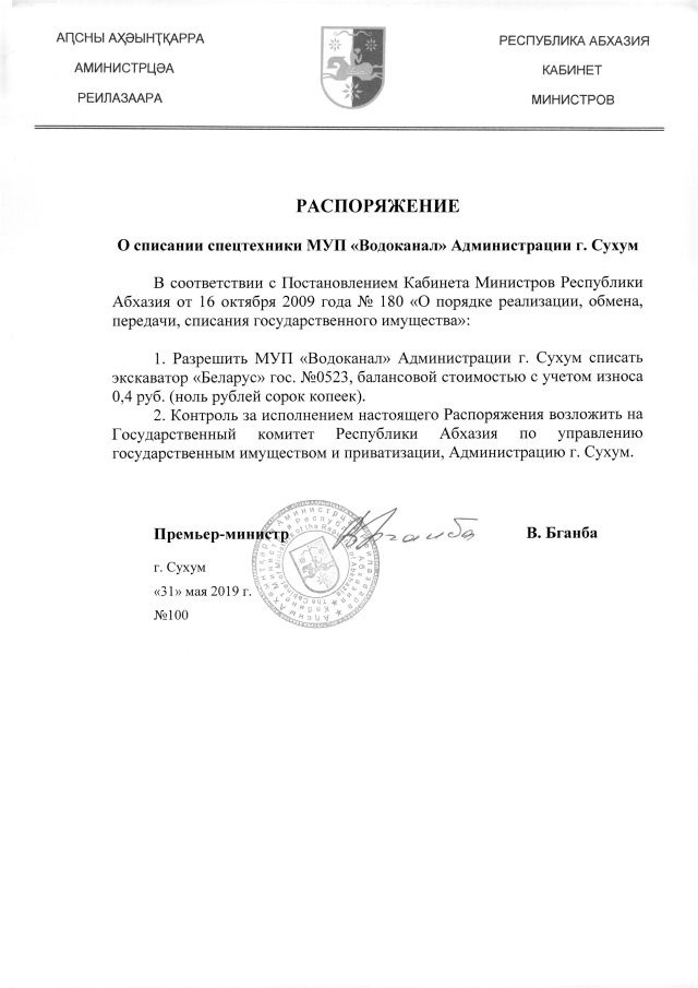 РАСПОРЯЖЕНИЕ Кабинета Министров Республики Абхазия от 31.05.2019 №100 "О списании спецтехники МУП "Водоканал" Администрации г. Сухум"