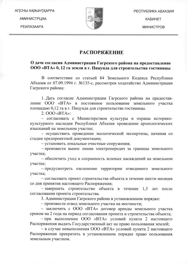 РАСПОРЯЖЕНИЕ Кабинета Министров Республики Абхазия от 31.05.2019 №101 "О даче согласия Администрации Гагрского района на предоставление ООО "ВТА" 0,12 га земли в г. Пицунда для строительства гостиницы"