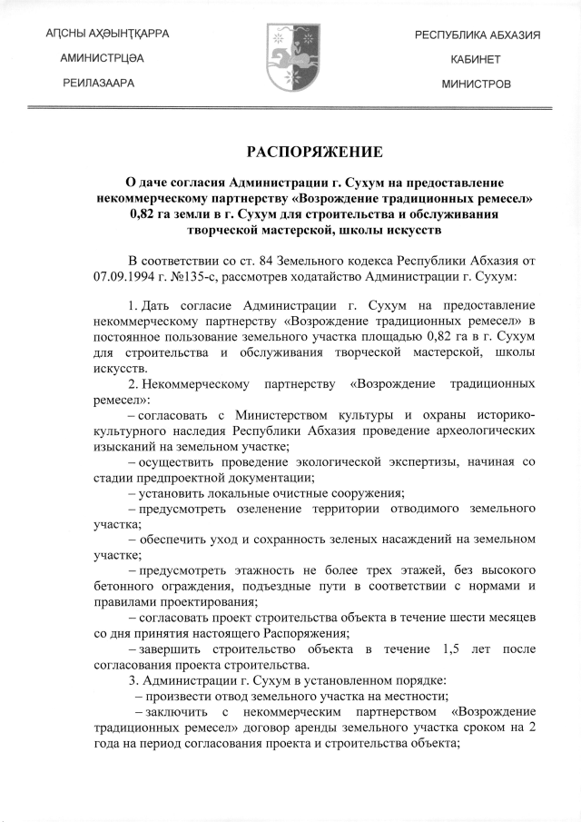РАСПОРЯЖЕНИЕ Кабинета Министров Республики Абхазия от 04.06.2019 №105 "О даче согласия Администрации г. Сухум на предоставление некоммерческому партнерству "Возрождение традиционных ремесел" 0,82 га земли в г. Сухум для строительства и обслуживания творческой мастерской, школы искусств"