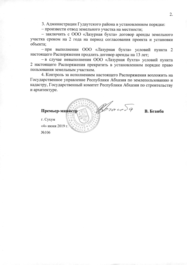РАСПОРЯЖЕНИЕ Кабинета Министров Республики Абхазия от 04.06.2019 №106 "О даче согласия Администрации Гудаутского района на предоставление ООО "Лазурная бухта" 0,19 га земли в с. Амжыкхуа для установки средства размещения гостиничного типа (сборно┐разборная конструкция - сооружение облегченного типа)"
