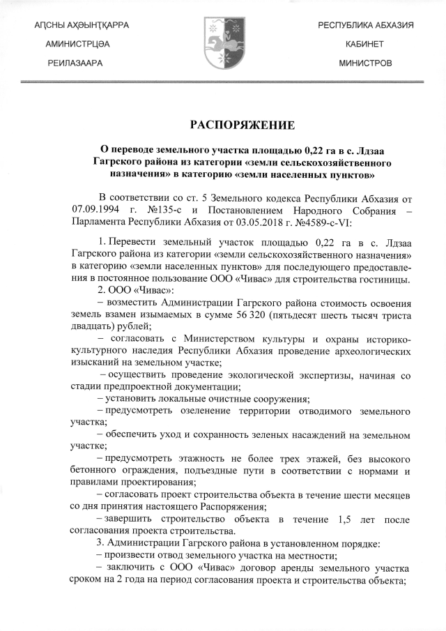 РАСПОРЯЖЕНИЕ Кабинета Министров Республики Абхазия от 04.06.2019 №107 "О переводе земельного участка площадью 0,22 га в с. Лдзаа Гагрского района из категории "земли сельскохозяйственного назначения" в категорию "земли населенных пунктов""