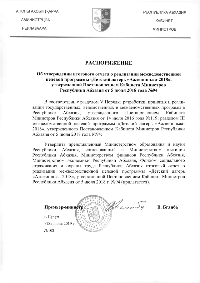 РАСПОРЯЖЕНИЕ Кабинета Министров Республики Абхазия от 18.06.2019 №108 "Об утверждении итогового отчета о реализации межведомственной целевой программы "Детский лагерь "Ажэеипшьаа-2018", утвержденной Постановлением Кабинета Министров Республики Абхазии от 5 июля 2018 года №94"