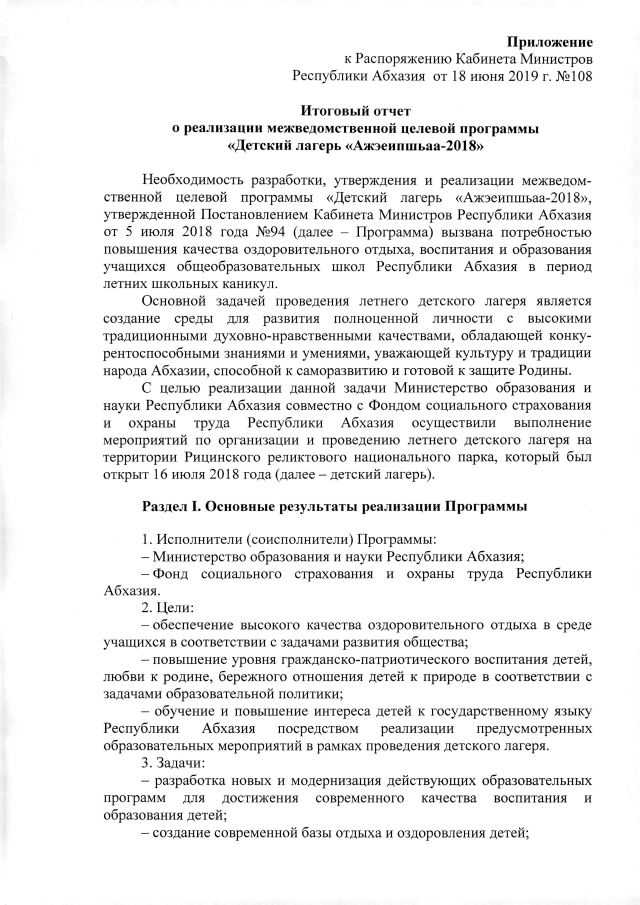 РАСПОРЯЖЕНИЕ Кабинета Министров Республики Абхазия от 18.06.2019 №108 "Об утверждении итогового отчета о реализации межведомственной целевой программы "Детский лагерь "Ажэеипшьаа-2018", утвержденной Постановлением Кабинета Министров Республики Абхазии от 5 июля 2018 года №94"