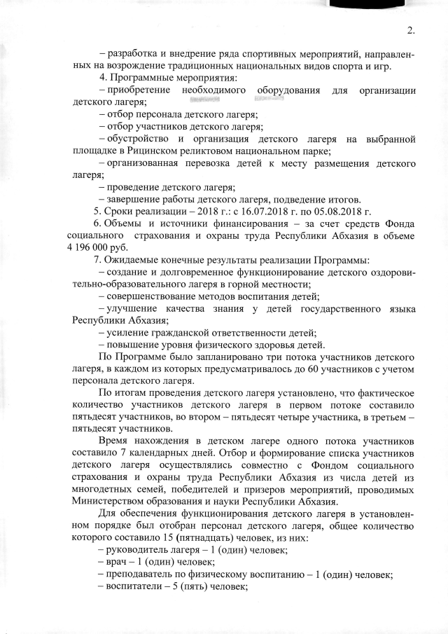 РАСПОРЯЖЕНИЕ Кабинета Министров Республики Абхазия от 18.06.2019 №108 "Об утверждении итогового отчета о реализации межведомственной целевой программы "Детский лагерь "Ажэеипшьаа-2018", утвержденной Постановлением Кабинета Министров Республики Абхазии от 5 июля 2018 года №94"
