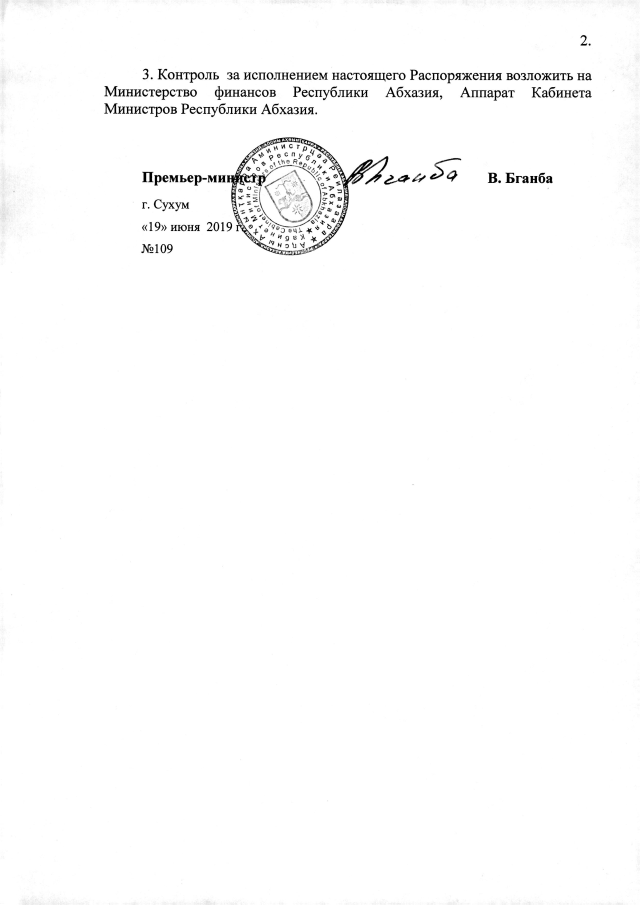 РАСПОРЯЖЕНИЕ Кабинета Министров Республики Абхазия от 19.06.2019 №109 "Об использовании средств резервного фонда Кабинета Министров Республики Абхазия"