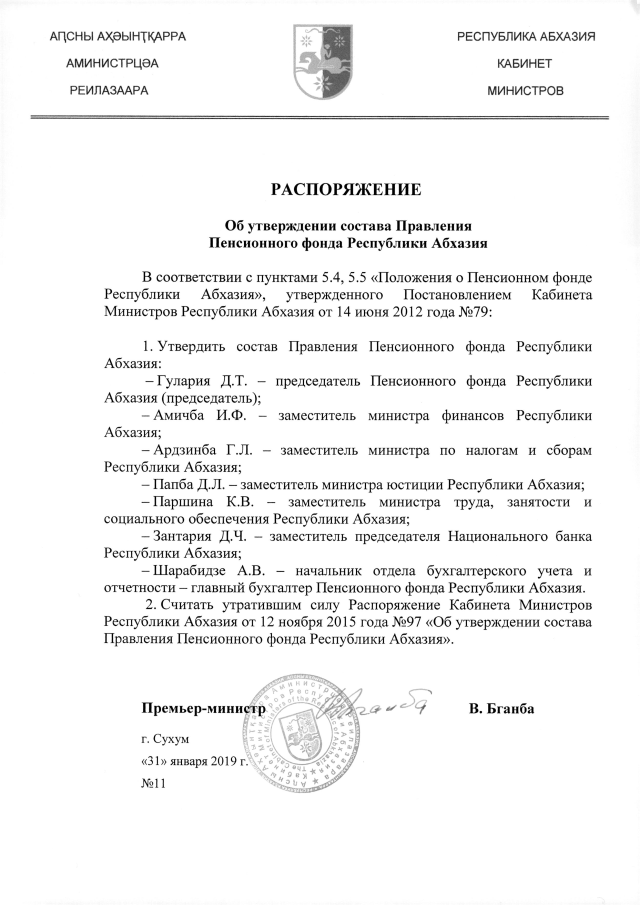 РАСПОРЯЖЕНИЕ Кабинета Министров Республики Абхазия от 31.01.2019 №11 "Об утверждении состава Правления Пенсионного фонда Республики Абхазия"