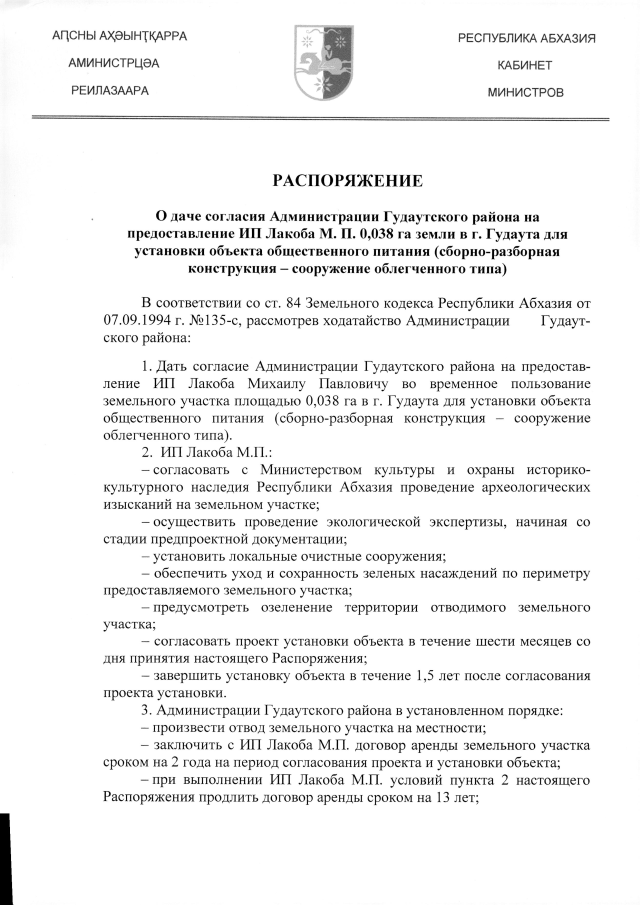 РАСПОРЯЖЕНИЕ Кабинета Министров Республики Абхазия от 26.06.2019 №112 "О даче согласия Администрации Гудаугского района на предоставление ИП Лакоба М.П. 0,038 га земли в г. Гудаута для установки объекта общественного питания (сборно-разборная конструкция - сооружение облегченного типа)"