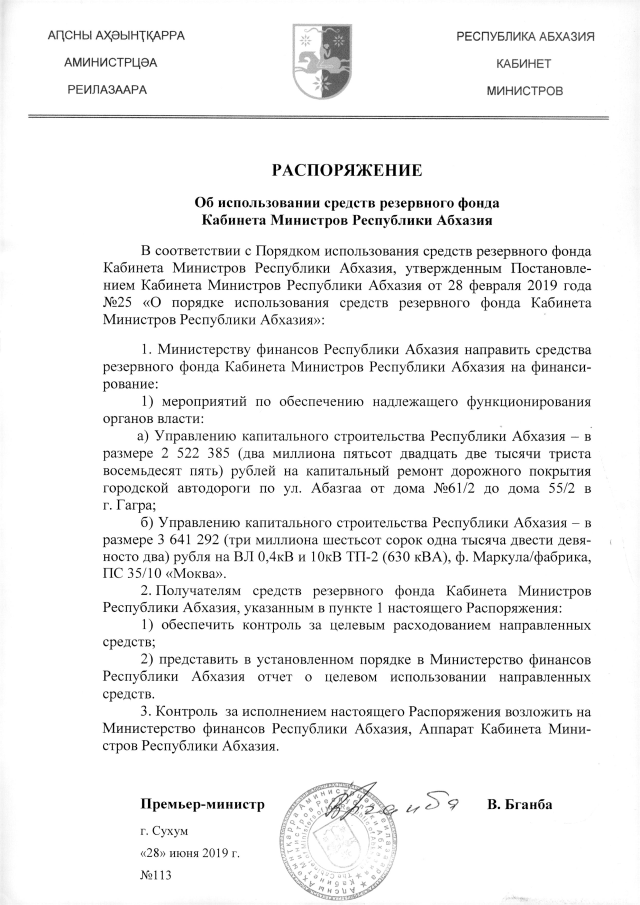 РАСПОРЯЖЕНИЕ Кабинета Министров Республики Абхазия от 28.06.2019 №113 "Об использовании средств резервного фонда Кабинета Министров Республики Абхазия"