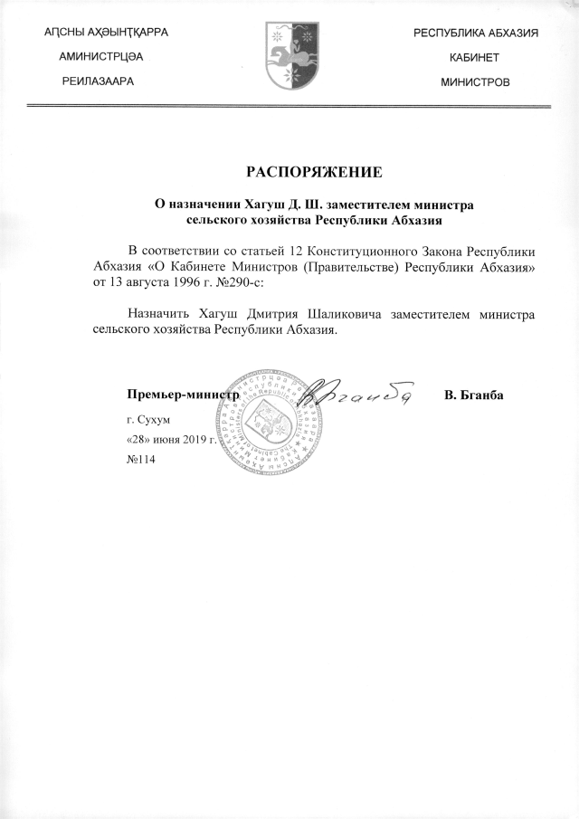 РАСПОРЯЖЕНИЕ Кабинета Министров Республики Абхазия от 28.06.2019 №114 "О назначении Хагуш Д.Ш. заместителем министра сельского хозяйства Республики Абхазия"