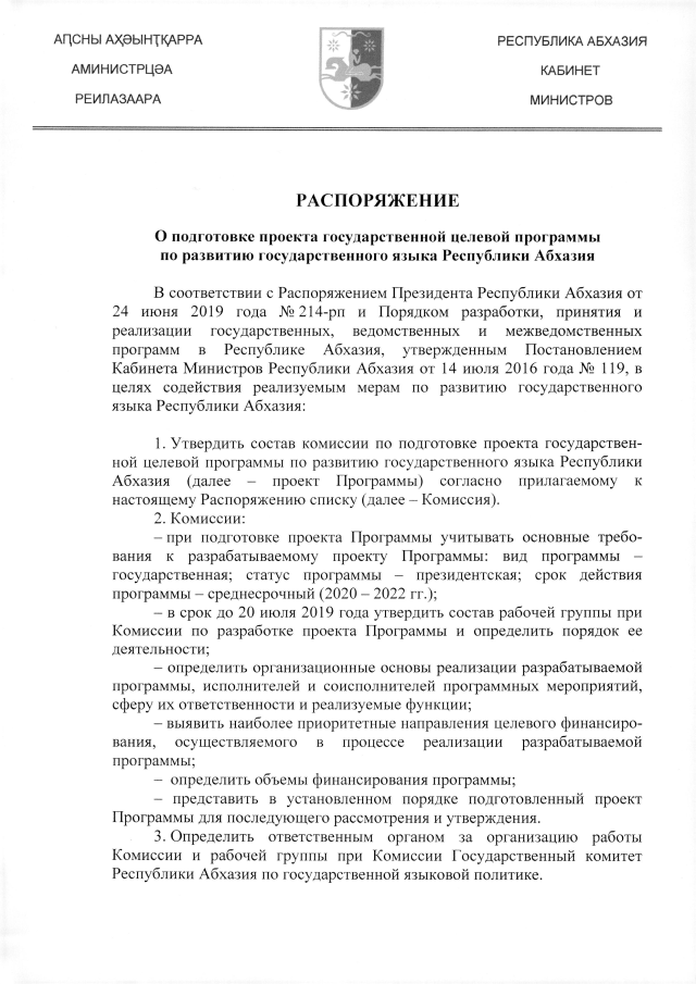РАСПОРЯЖЕНИЕ Кабинета Министров Республики Абхазия от 28.06.2019 №115 "О подготовке проекта государственной целевой программы по развитию государственного языка Республики Абхазия"