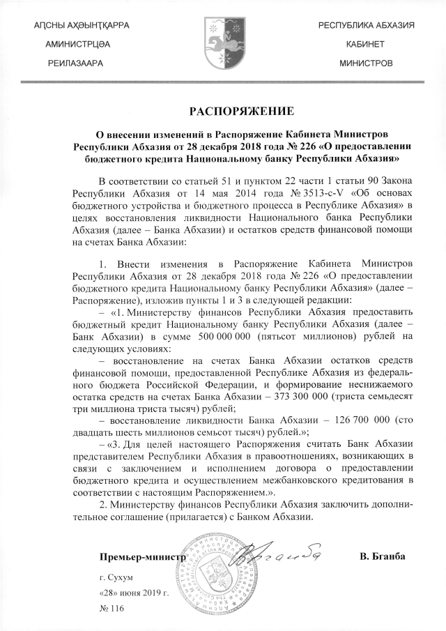 РАСПОРЯЖЕНИЕ Кабинета Министров Республики Абхазия от 28.06.2019 №116 "О внесении изменений в Распоряжение Кабинета Министров Республики Абхазия от 28 декабря 2018 года № 226 "О предоставлении бюджетного кредита Национальному банку Республики Абхазия""